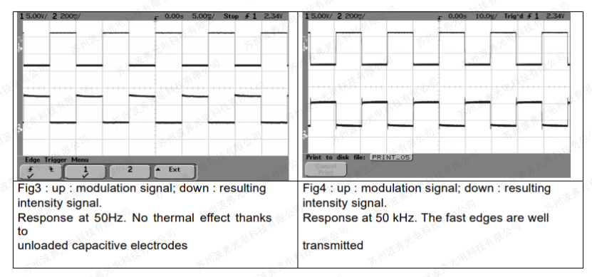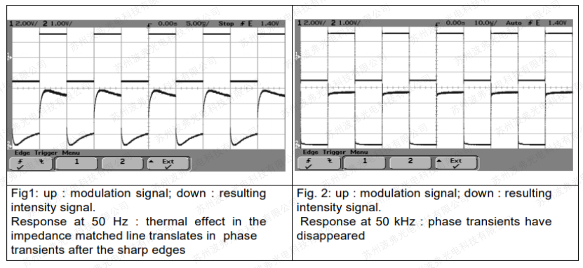 下面的圖1和圖2示出了當(dāng)使用50Hz和50KHz方波調(diào)制信號(hào)時(shí),使用高帶寬相位調(diào)制器(MPZ-LN-20型,>20GHz電光帶寬)。熱效應(yīng)的影響在圖1中非常低頻時(shí)清晰可見,在50kHz時(shí)熱效應(yīng)幾乎消失