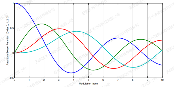 其輸出光譜服從貝塞爾函數分布,如下圖,藍色代表載波,其他依次為±1,±2,±3階邊帶,輸出光譜強度隨調制深度的變化(Modulation index),此調制深度也可等效理解為調制器的驅動電壓。