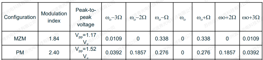 3. 強度調制器所產生的1階邊帶強度高于相位調制器(見下表),因為相位調制器有部分強度分布在其他階邊帶上