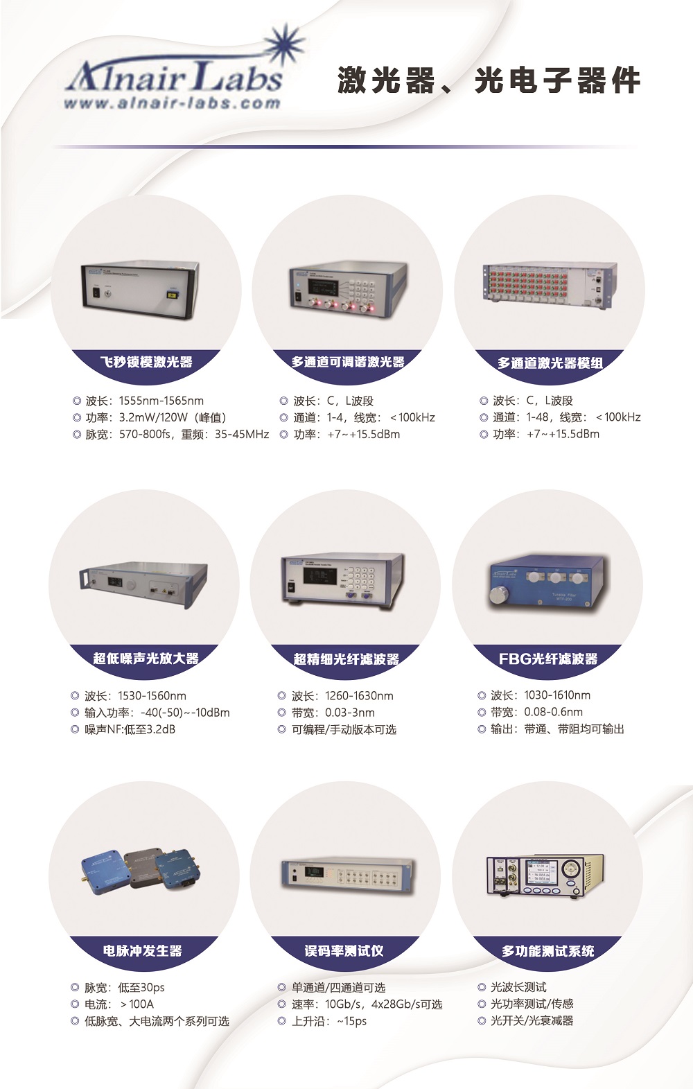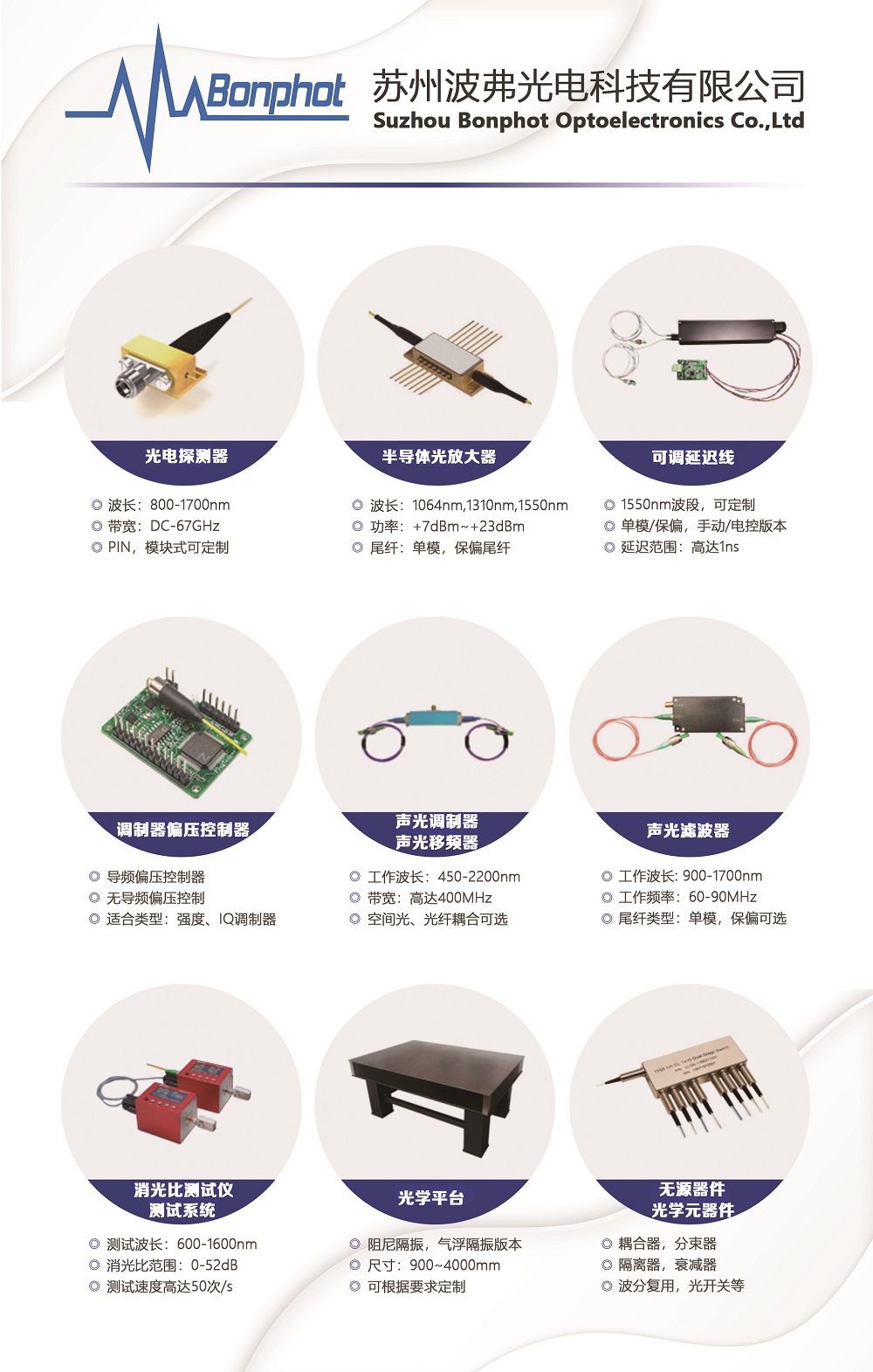 目前提供的主要產(chǎn)品:激光器,寬帶光源,電光調(diào)制器(大量現(xiàn)貨庫存),聲光調(diào)制產(chǎn)品,光放大器,光電探測器/接收器,高速光開關(guān)/開關(guān)矩陣,光纖濾波器,光學(xué)延遲線,偏振相關(guān)器件,自相關(guān)儀,光譜分析儀,太赫茲相關(guān)器件,高速電子產(chǎn)品,數(shù)據(jù)采集卡,激光二極管,激光器驅(qū)動(dòng),光纖及光纖熔接處理,光纖干涉儀,氣室/氣池,光學(xué)相干斷層掃描系統(tǒng),相機(jī),OCT光譜儀,掃描振鏡,MEMS振鏡,光機(jī)械器件,光學(xué)平臺(tái)。