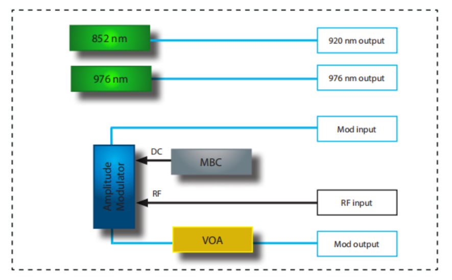 ? 內(nèi)嵌兩個激光源,一個852 nm和976 nm低RIN DBR激光器。為了便于使用,省略了一根外部接插線,將激光輸出連接到調(diào)制器輸入光端口。波長和功率可通過前面板控制或ModBox軟件接口進行調(diào)整。